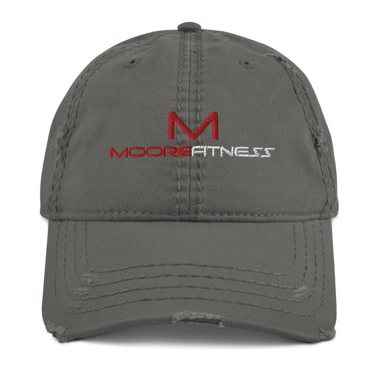 Complete your casual look with the Moore Fitness Distressed Dad Hat, featuring intentional distressing, an adjustable fit, and bold logo embroidery for a rugged yet stylish finish.